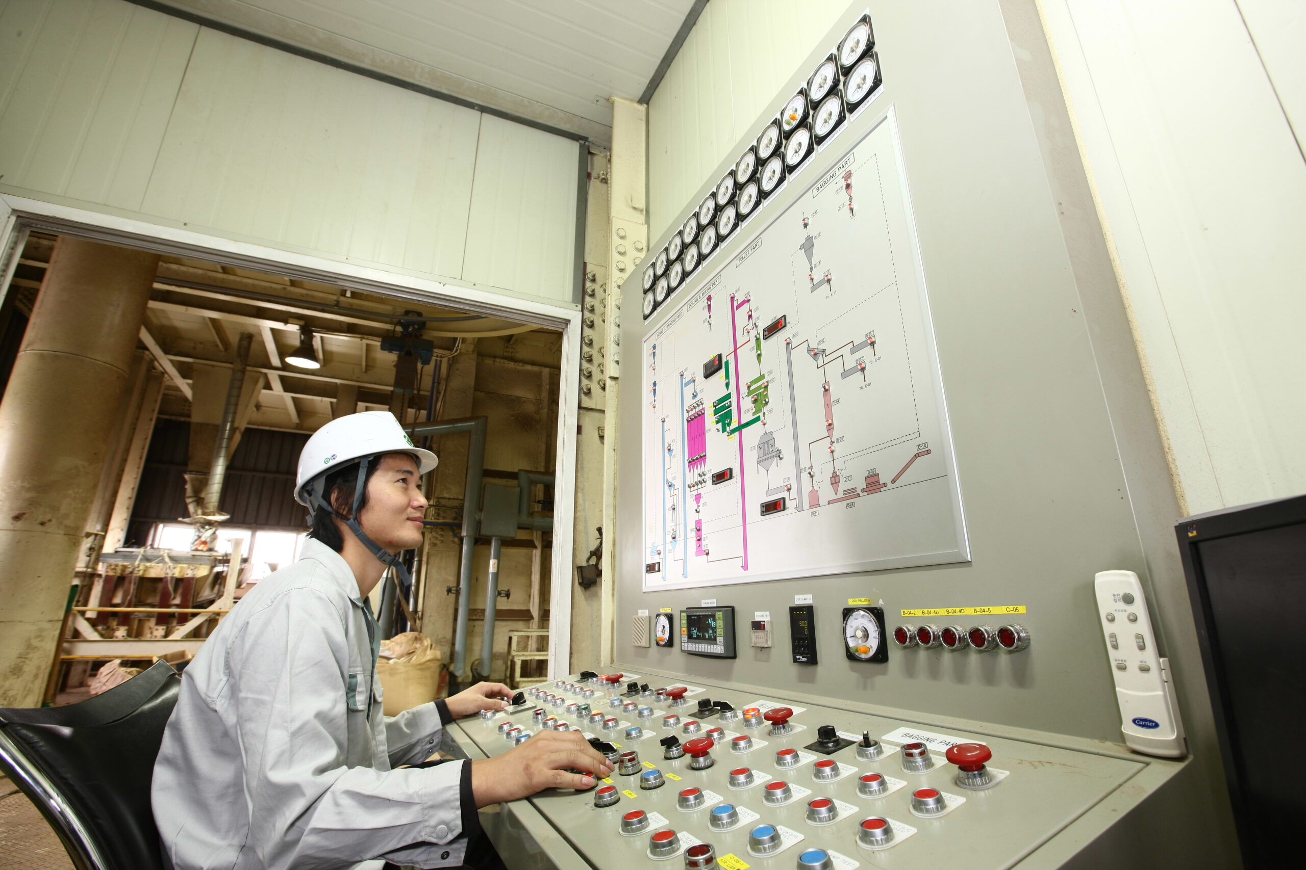 Authentic products of organic agricultural fertilizers are being manufactured in accordance with the required specifications after all raw materials are measured and assorted at each storage silo by a computer system.